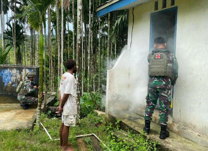 Cegah Timbulnya Bibit Penyakit Malaria, Satgas Yonif 131/BRS Lakukan Fogging di Rumah Warga Perbatasan Papua