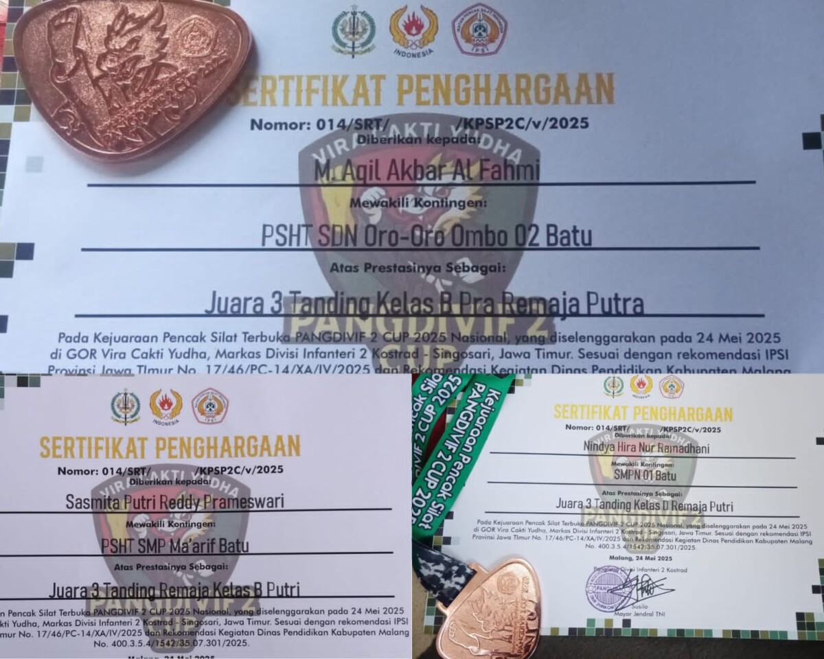 – Juara 3 Tanding Kelas B Pra Remaja Putra( M. Aqil Akbar AlFahmi ) SDN Oro-oro Ombo 02 Batu.
