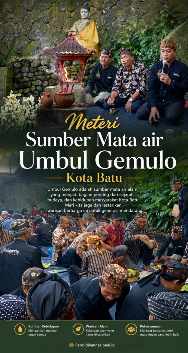 Batu, PENDIDIKANNASIONAL.ID – Pagi ini, suasana di Sumber Umbul Gemulo, Desa Pulekerto, terasa berbeda. Bukan hanya karena udara segar khas pegunungan yang menyapa, tetapi karena ada getaran syukur yang mengalir dari setiap gerak-gerik warga. Mereka berkumpul, duduk melingkar, membawa tumpeng dan hasil bumi. Bukan sekadar kenduri biasa, ini adalah Metri Sumber sebagai ritual adat yang sudah mengakar turun-temurun. ( 23/04/2026 ).