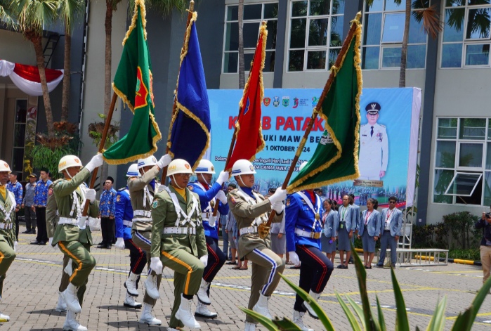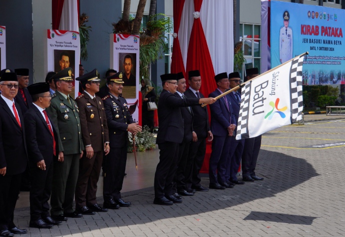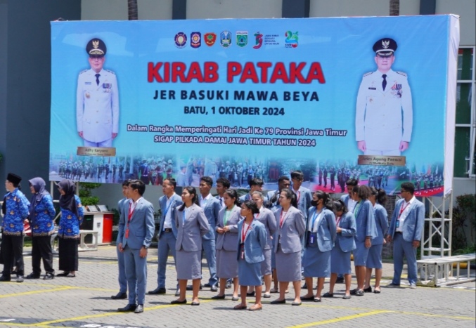 Batu, Pendidikannasional.id – Kirab Pataka Jer Basuki Mawa Beya untuk merayakan Hari Jadi (HUT) Ke-79 Provinsi Jawa Timur telah tiba di Balai Kota Among Tani, Kota Batu pada Selasa (1/10), setelah sebelumnya Pataka tersebut tiba di Kota Malang pada hari sebelumnya. Kirab Pataka Jer Basuki Mawa Beya ini menampilkan delapan bendera dan pataka, yang meliputi Bendera Merah Putih, Pataka Jer Basuki Mawa Beya (Lambang Daerah Provinsi Jawa Timur), Bendera Lambang Komisi Pemilihan Umum (KPU), Bendera Lambang Badan Pengawas Pemilu (Bawaslu), Pataka dari Satuan Polisi Pamong Praja (Satpol PP) – Praja Wibawa, Pataka dari Satuan Perlindungan Masyarakat (Satlinmas), Pataka dari Satuan Pemadam Kebakaran dan Penyelamatan – Yudha Brama Jaya, serta Bendera Logo Hari Jadi Ke-79 Provinsi Jawa Timur untuk Tahun 2024.